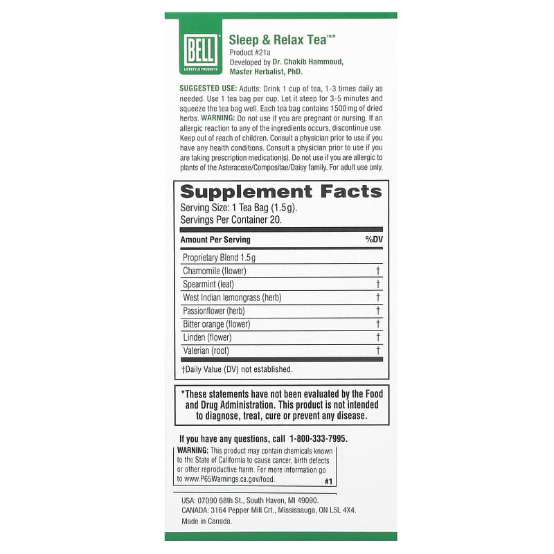 Trà Ngủ Ngon & Thư Giãn Bell Lifestyle giúp giảm stress, hỗ trợ giấc ngủ, 20 túi trà tự nhiên, 30g. Thư giãn hiệu quả mỗi ngày., UPC 771733113038