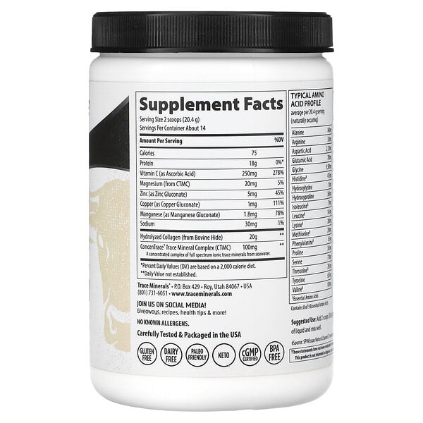 Thông tin sản phẩm Trace Minerals ®, Grass-Fed Collagen Peptides, không mùi vị, 10,1 oz (286 g)