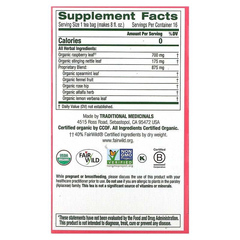 Trà Traditional Medicinals Organic Pregnancy Tea Raspberry Leaf được làm từ các thành phần tự nhiên và hữu cơ. Một số thành phần chính bao gồm: