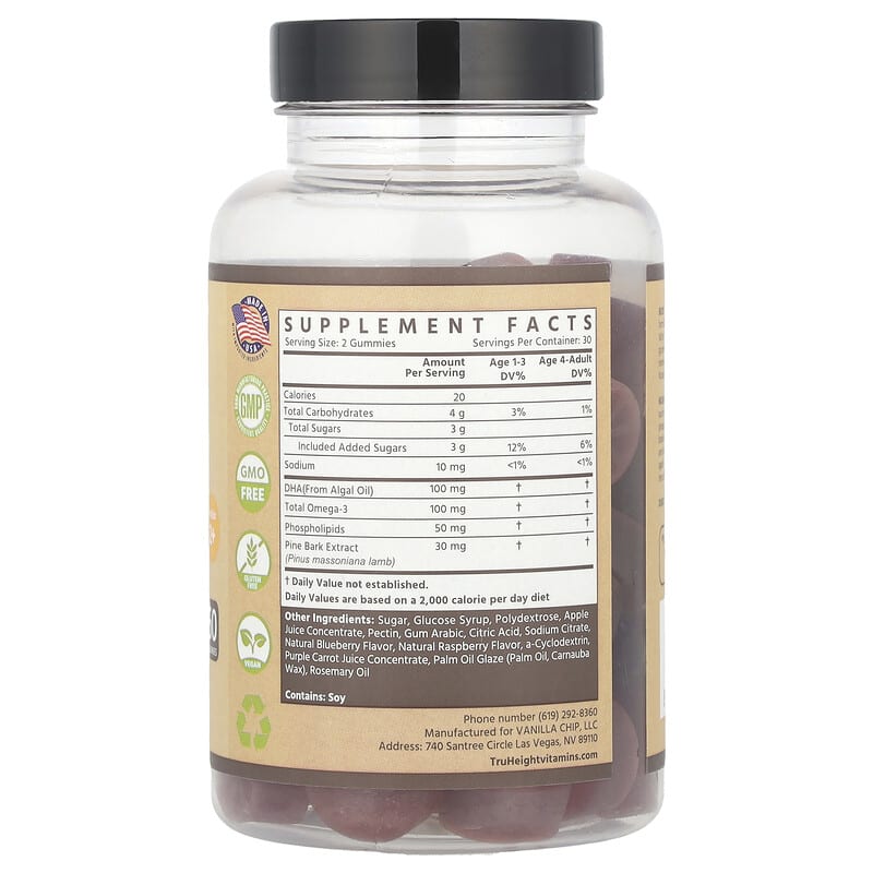 TruHeight Toddler & Kids Brain Growth chứa nhiều thành phần dinh dưỡng quan trọng, bao gồm: