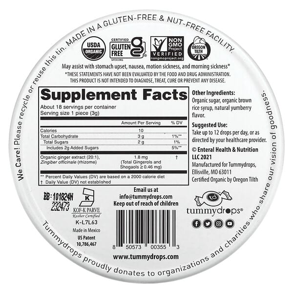 Tummydrops, Yumberry Ginger không chỉ được sản xuất trong một cơ sở không chứa gluten và hạt, mà còn được chứng nhận hữu cơ bởi Oregon Tilth. Điều này đảm bảo rằng bạn đang sử dụng một sản phẩm an toàn, không chứa GMO và phù hợp với chế độ ăn uống của nhiều người, bao gồm cả những người ăn chay và ăn kiêng.