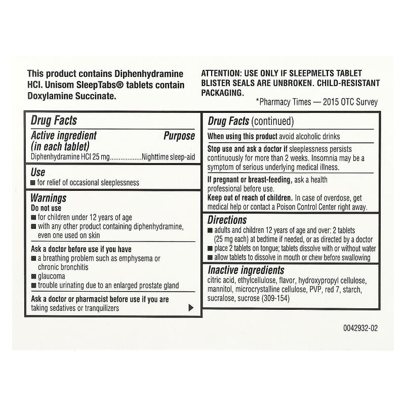 Unisom SleepMelts chứa thành phần chính là Diphenhydramine HCl với liều lượng 25 mg cho mỗi viên. Diphenhydramine là một loại thuốc kháng histamine, giúp giảm cảm giác lo âu và tạo điều kiện cho giấc ngủ tự nhiên. Ngoài ra, sản phẩm còn có các thành phần không hoạt động như acid citric, ethylcellulose, hương liệu, hydroxypropyl cellulose, mannitol, microcrystalline cellulose, PVP, màu thực phẩm đỏ 7, tinh bột, sucralose và sucrose.