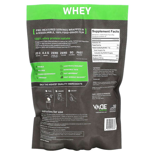 Thông tin sản phẩm Vade Nutrition, Dissolvable Protein Packs, 100% Whey Isolate, Vanilla Milkshake, 1,6 lb (720 g)