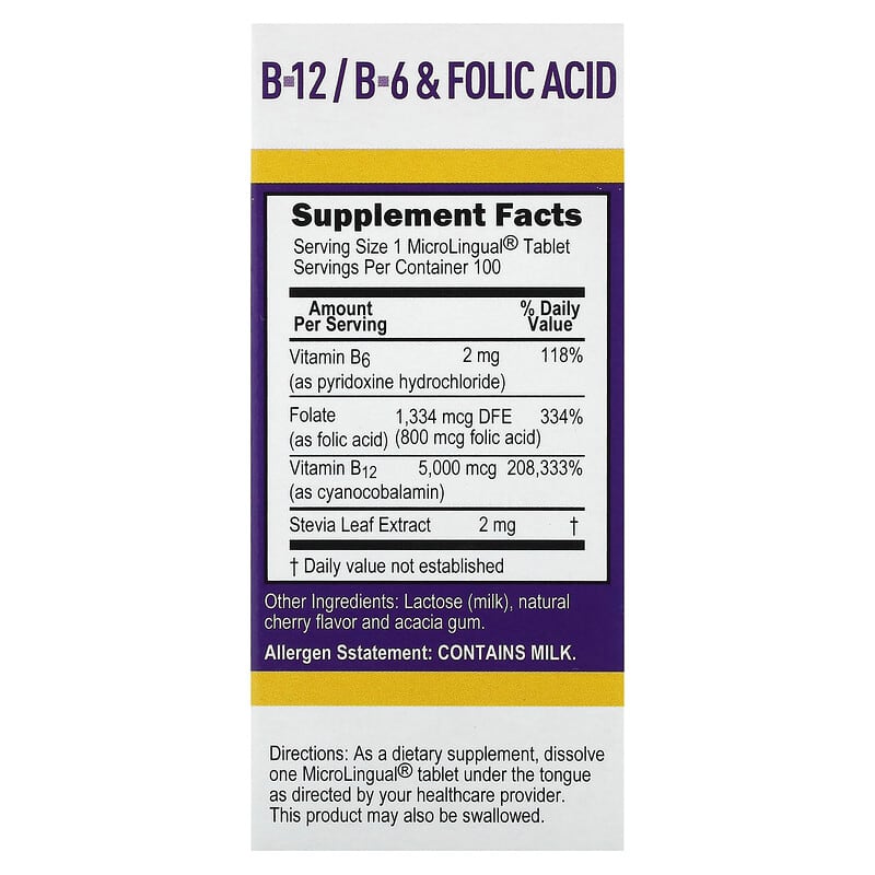 Viên nén hòa tan tức thì Superior Source B-12 B-6 & Folic Acid chứa các thành phần chính sau: