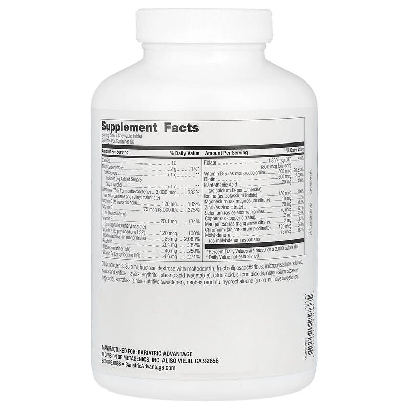 Bariatric Advantage Chewable Ultra Solo là một loại viên nhai dinh dưỡng chứa nhiều vitamin và khoáng chất thiết yếu. Mỗi viên bao gồm: