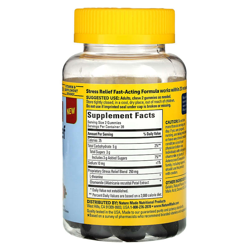 Nature Made Stress Relief Gummies chứa các thành phần tự nhiên được nghiên cứu kỹ lưỡng để giúp giảm stress một cách nhanh chóng và an toàn. Thành phần chính bao gồm: