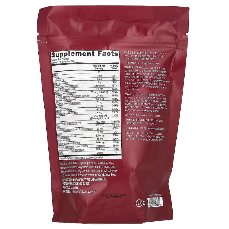 Bariatric Advantage Multi Chewy Bite Tropical Orange được thiết kế đặc biệt cho những người đã trải qua phẫu thuật giảm cân, giúp bổ sung đầy đủ các vitamin và khoáng chất cần thiết cho cơ thể. Sản phẩm giúp: