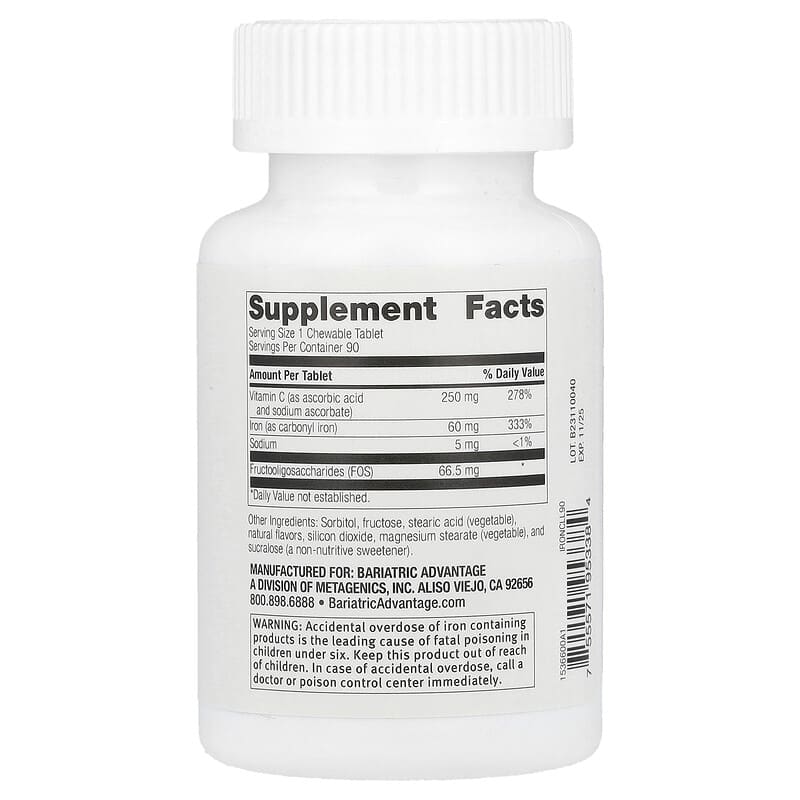 Mỗi viên nén nhai Bariatric Advantage cung cấp 60 mg sắt từ carbonyl iron, một dạng sắt dễ hấp thu. Bên cạnh đó, sản phẩm còn chứa 250 mg vitamin C dưới dạng ascorbic acid và sodium ascorbate, giúp tối ưu hóa khả năng hấp thụ sắt trong cơ thể. Ngoài ra, mỗi viên cũng chứa fructooligosaccharides (FOS) có tác dụng hỗ trợ tiêu hóa.