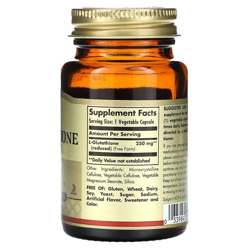 Viên uống L-Glutathione Solgar 250mg hỗ trợ làm sáng da, tăng sức đề kháng, 30 viên chay an toàn cho sức khỏe., UPC 033984013506