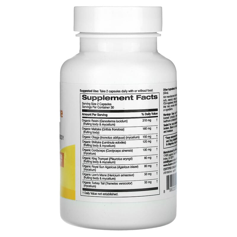 Super Nutrition Mushroom Immune Complex chứa 1,000 mg hỗn hợp nấm phổ rộng trong mỗi khẩu phần. Các thành phần chính bao gồm: