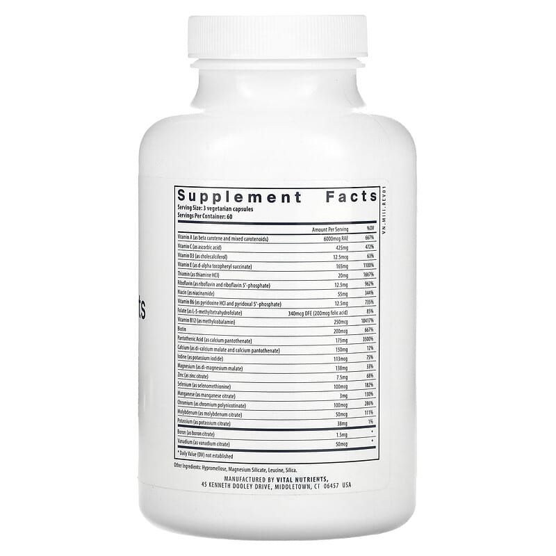 Vital Nutrients Multi-Nutrients Citrate/Malate không chứa đồng và sắt, giúp giảm thiểu nguy cơ thừa chất khoáng không cần thiết cho cơ thể. Sản phẩm chứa nhiều vitamin và khoáng chất thiết yếu, bao gồm: