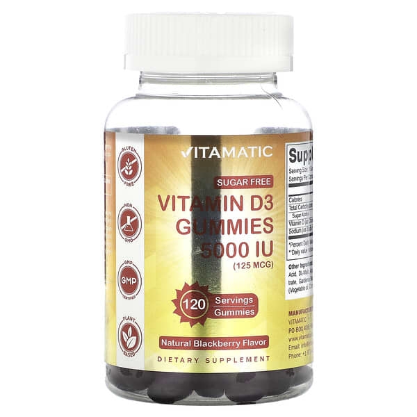Thông tin sản phẩm Vitamatic, Sugar Free Vitamin D3 Gummies, Natural Blackberry, 125 mcg (5.000 IU), 120 viên nhai