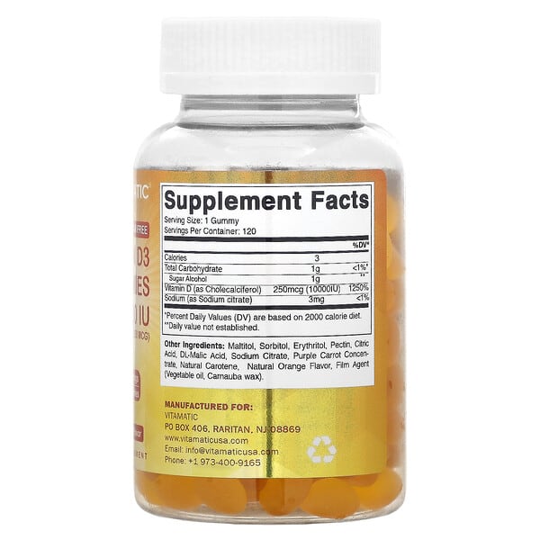 Mỗi viên nhai Vitamatic Vitamin D3 cung cấp 250 mcg (10.000 IU) vitamin D3, tương đương 1.250% giá trị dinh dưỡng hàng ngày. Ngoài ra, sản phẩm còn chứa các thành phần khác như maltitol, sorbitol, erythritol, pectin, citric acid, dl-malic acid, sodium citrate, purple carrot concentrate, natural carotene và natural orange flavor. Đặc biệt, sản phẩm hoàn toàn không chứa đường, không chất bảo quản, không đậu nành, không màu nhân tạo và không hương liệu hay chất tạo ngọt nhân tạo.