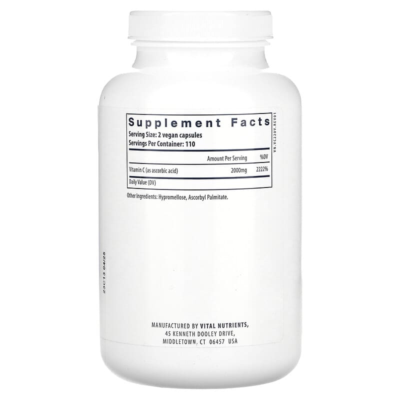 Vital Nutrients Vitamin C được sản xuất từ 100% ascorbic acid tinh khiết. Mỗi phần dùng chứa 2000 mg vitamin C, chiếm 2222% giá trị hàng ngày (DV). Vitamin C không chỉ hỗ trợ hệ miễn dịch mà còn là một trong những chất chống oxy hóa mạnh mẽ nhất, giúp bảo vệ cơ thể khỏi các gốc tự do có hại. Ngoài ra, sản phẩm còn có các thành phần khác như hypromellose và ascorbyl palmitate, hoàn toàn không chứa gluten, sữa, đậu phộng, hạt cây, cá, động vật có vỏ, đậu nành, mè, trứng, hương liệu, phẩm màu, hay các phụ gia không cần thiết khác.