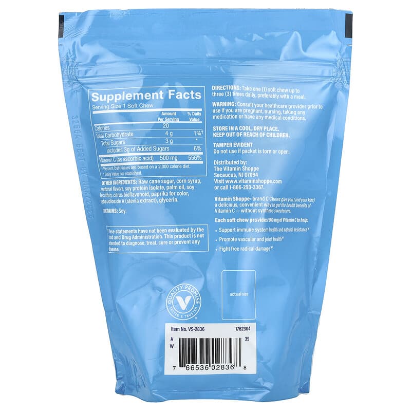Mỗi viên nhai Vitamin C từ The Vitamin Shoppe cung cấp 500 mg vitamin C dưới dạng axit ascorbic. Ngoài vitamin C, sản phẩm còn chứa các thành phần khác như đường mía thô, siro ngô, hương liệu tự nhiên, tinh bột đậu nành, dầu cọ, lecithin đậu nành, bioflavonoid từ cam, màu paprika, chiết xuất stevia (rebaudioside A) và glycerin. Đặc biệt, sản phẩm không chứa gluten, sữa và các loại hạt, phù hợp cho nhiều đối tượng sử dụng.