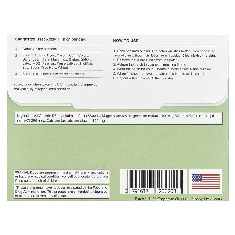 Miếng dán Vitamin D3 PatchAid giúp bổ sung vitamin D3 hiệu quả, hỗ trợ sức khỏe xương và hệ miễn dịch, 30 miếng., UPC 791617200203