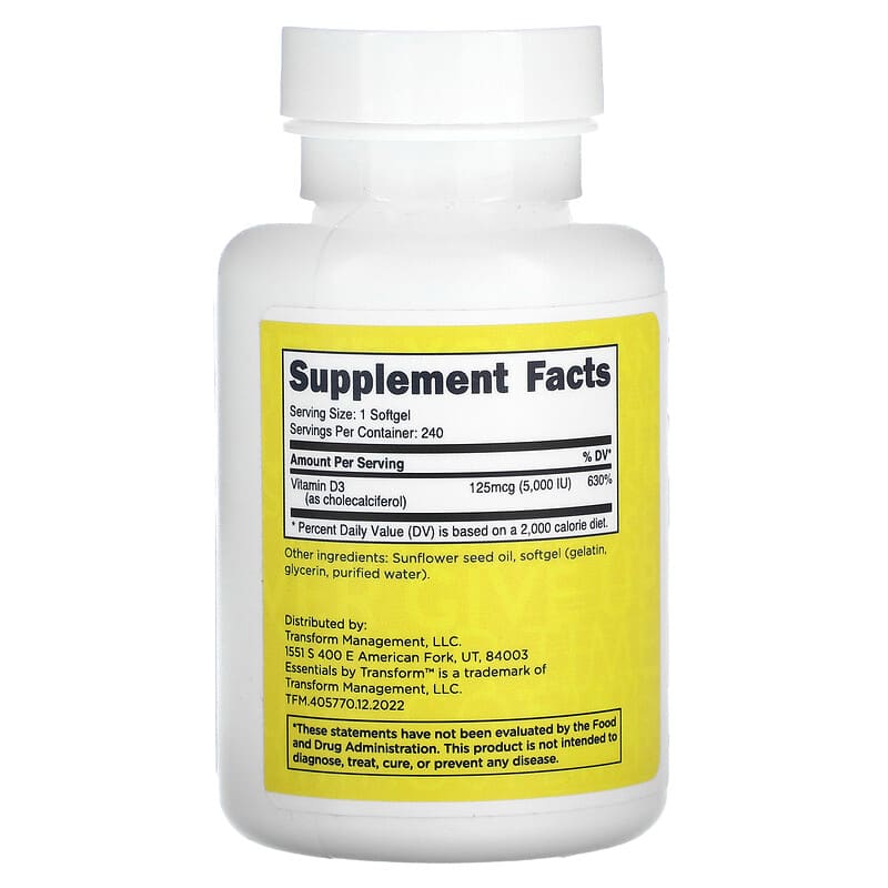 Viên uống Vitamin D3 TransformHQ 125 mcg giúp tăng cường sức đề kháng, hấp thu canxi, hỗ trợ xương khỏe mạnh. 240 viên tiện lợi., UPC 850040611380