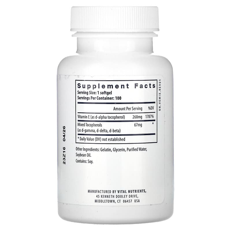 Viên uống vitamin E hỗn hợp tocopherol Vital Nutrients giúp bảo vệ sức khỏe, hỗ trợ da và tăng cường miễn dịch, 100 viên., UPC 693465521113