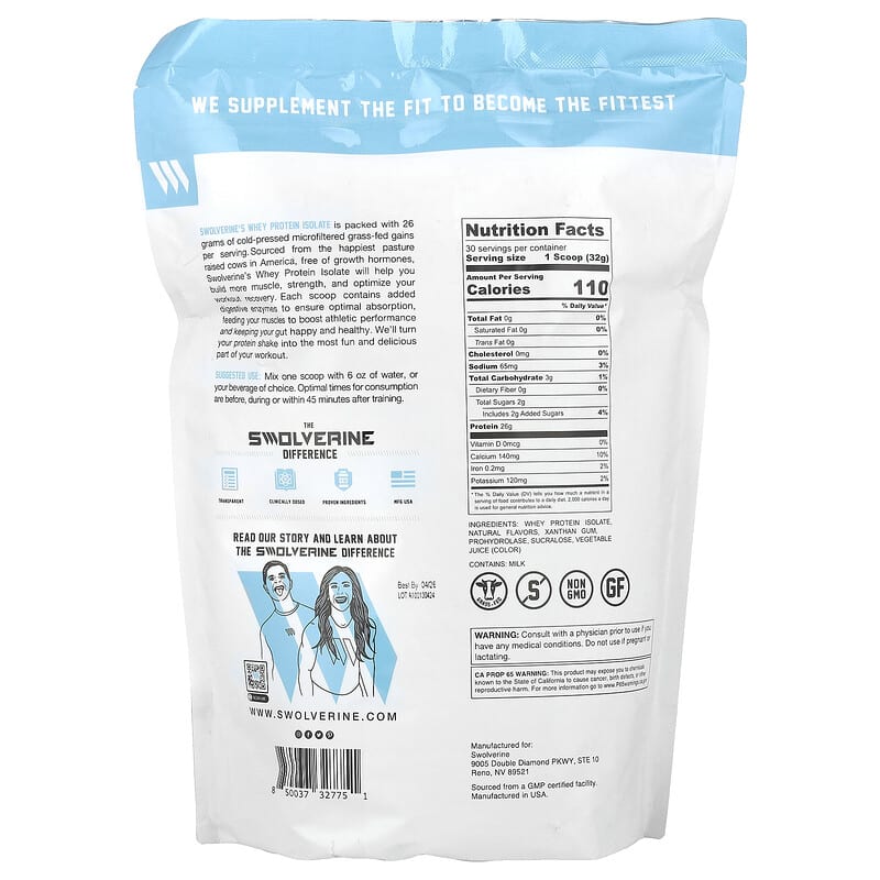 Swolverine Whey Isolate được sản xuất từ whey protein isolate cao cấp, chiết xuất từ sữa bò nuôi cỏ tự nhiên. Mỗi khẩu phần 32 g (một muỗng) chứa 26 g protein chất lượng cao, giúp hỗ trợ xây dựng cơ bắp và phục hồi sau tập luyện. Ngoài ra, sản phẩm còn chứa các thành phần khác như: