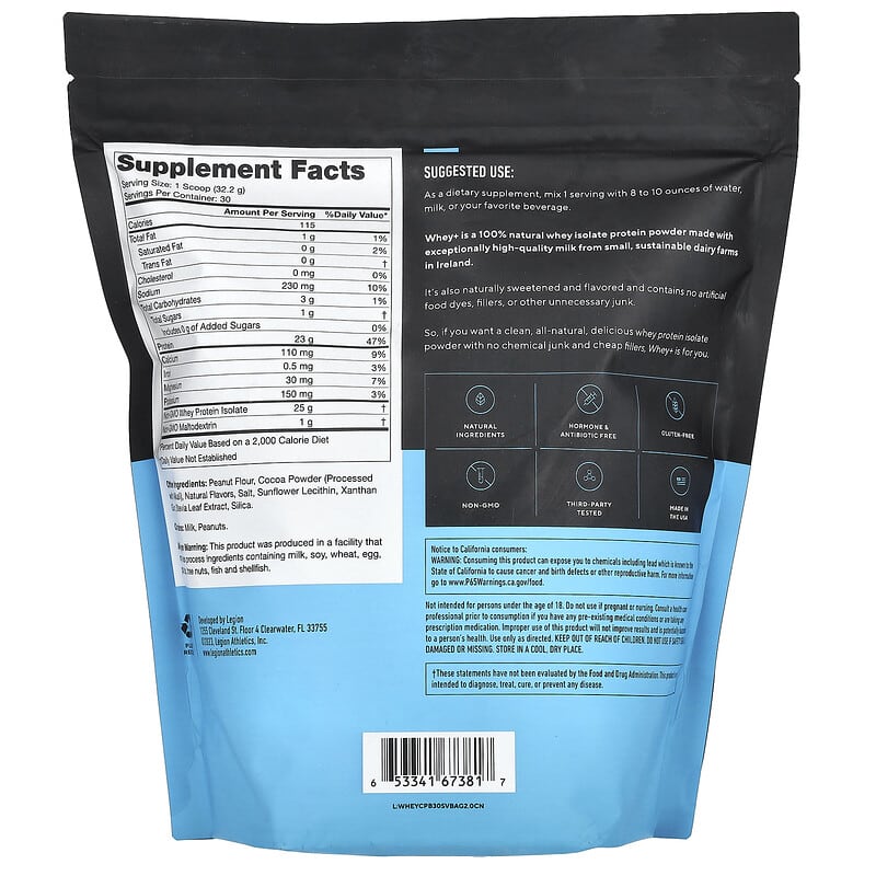 Bột protein whey Legion Athletics Whey+ socola bơ đậu phộng 2,13 lbs hỗ trợ phục hồi cơ bắp, tăng cường sức khỏe, hương vị ngon., UPC 653341673817