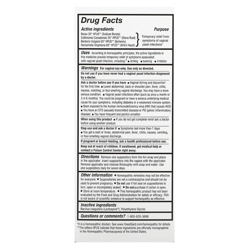 YeastGard Advanced Yeast Gard Suppositories chứa các thành phần hoạt tính theo nguyên tắc homeopathic, bao gồm: