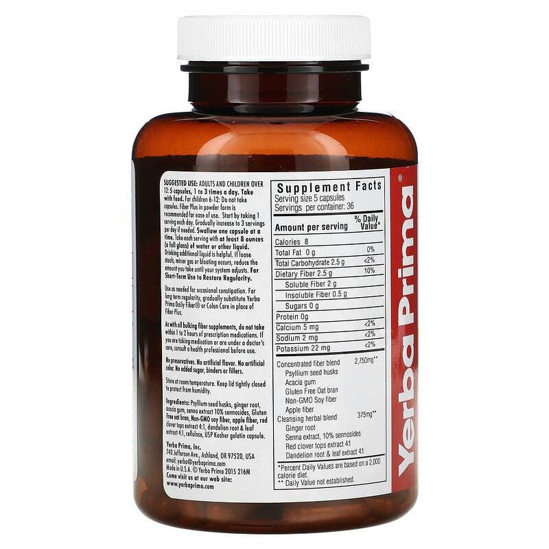 Yerba Prima Fiber Plus Senna Caps 180 viên hỗ trợ tiêu hóa, tăng cường sức khỏe đường ruột, sản phẩm tự nhiên an toàn và hiệu quả. 046352002163