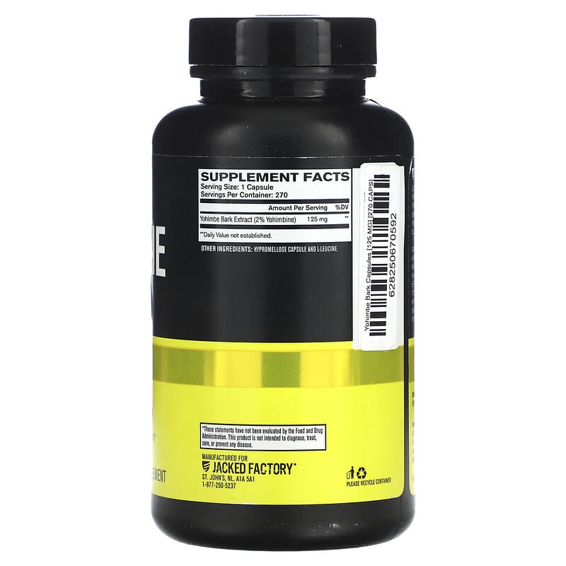Mỗi viên Jacked Factory Yohimbine chứa 125 mg chiết xuất vỏ cây Yohimbe, với 2% Yohimbine. Đây là thành phần chính có tác dụng hỗ trợ quá trình giảm mỡ và tăng cường trao đổi chất. Ngoài ra, sản phẩm còn chứa Hypromellose (vỏ viên nang) và L-Leucine, một axit amin quan trọng trong việc xây dựng và phục hồi cơ bắp.