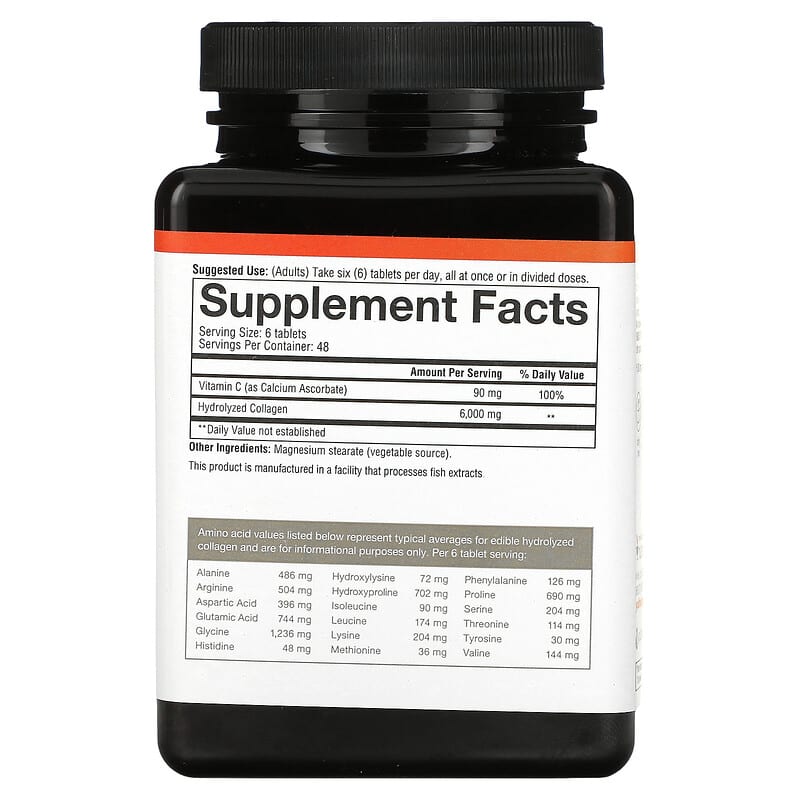 Amino acid values listed below represent typical averages for edible hydrolyzed collagen and are for informational purposes only. Per 6 tablets serving: | |