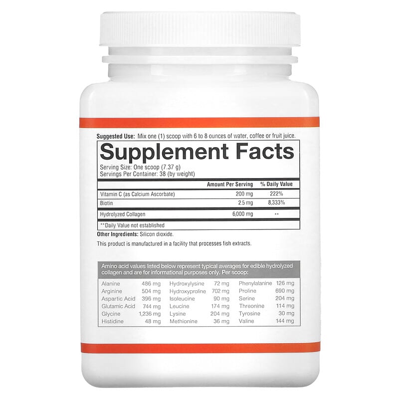 Amino acid values listed below represent typical averages for edible hydrolyzed collagen and are for informational purposes only. Per scoop: | |||||