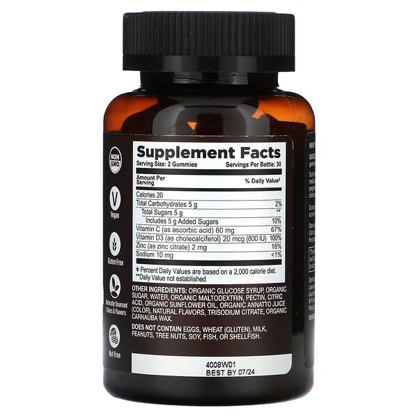 Thông tin sản phẩm YumVs, Strong Earth Organic Gummies, Vitamin C with Vitamin D3 & Zinc, Mandarin & Orange, 60 viên nhai