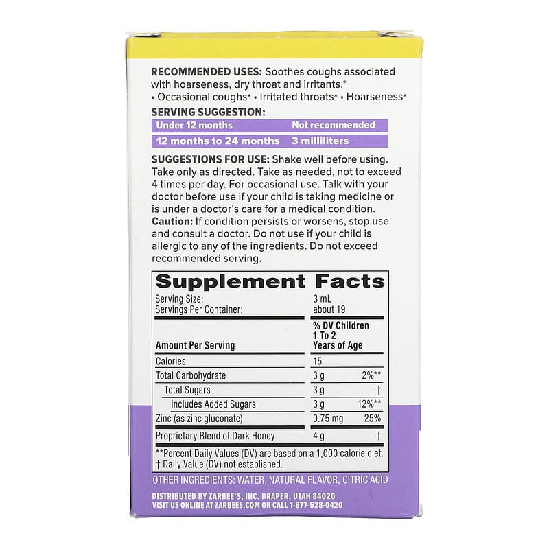 Sản phẩm Zarbee’s Baby Cough Syrup được thiết kế đặc biệt để giúp làm dịu các cơn ho liên quan đến tình trạng khản tiếng, họng khô và các tác nhân gây kích ứng. Thành phần chính của sản phẩm là mật ong tối màu, giúp làm dịu và an ủi cổ họng của bé. Ngoài ra, sản phẩm còn được bổ sung kẽm để hỗ trợ hệ miễn dịch, giúp bé khỏe mạnh hơn trong những ngày thời tiết xấu.