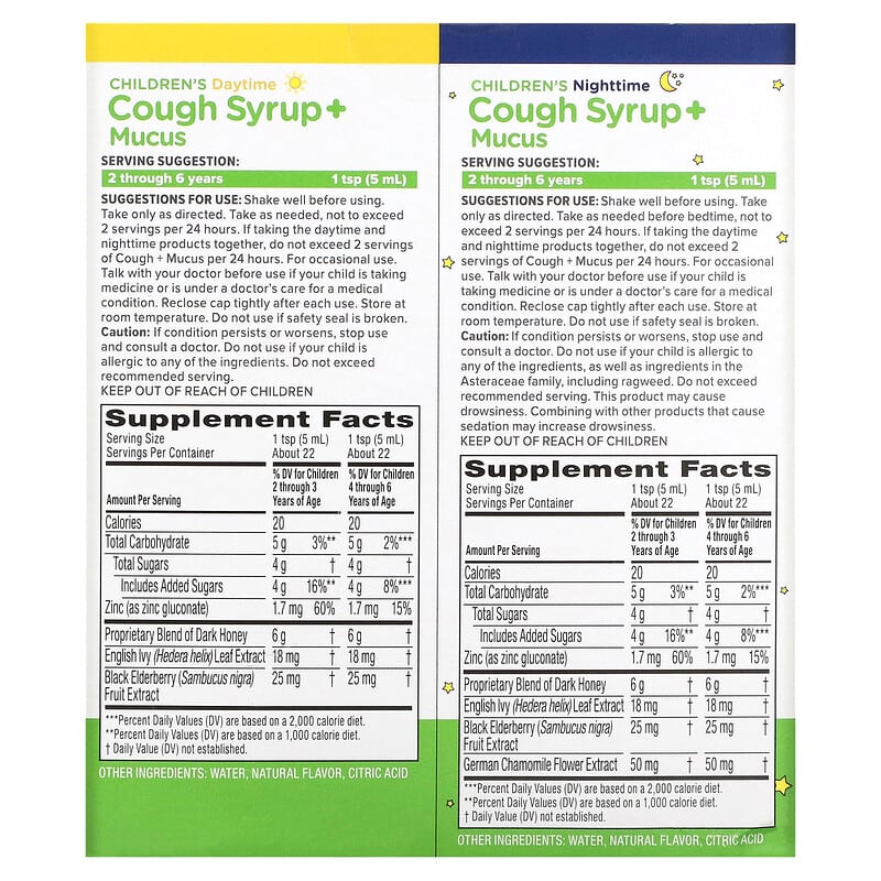Zarbee’s Children’s Cough Syrup + Mucus được thiết kế để giúp giảm ho và làm dịu cổ họng cho trẻ nhỏ. Sản phẩm bao gồm hai loại syrup: loại sử dụng vào ban ngày và loại sử dụng vào ban đêm.