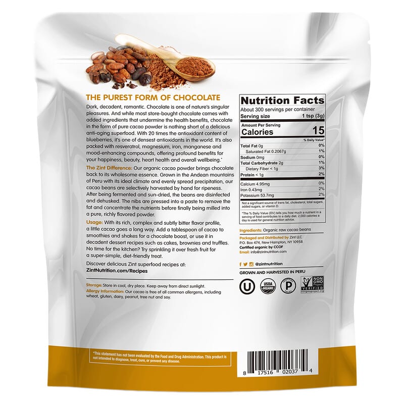 Bột cacao hữu cơ Zint Raw 32 oz (907 g) nguyên chất, giàu dinh dưỡng, thích hợp cho chế độ ăn uống lành mạnh và làm bánh. 817516020374
