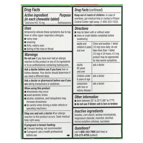 Thông tin sản phẩm Zyrtec, Allergy, Cetirizine HCl, Dye-Free, 10 mg, 24 viên nhai